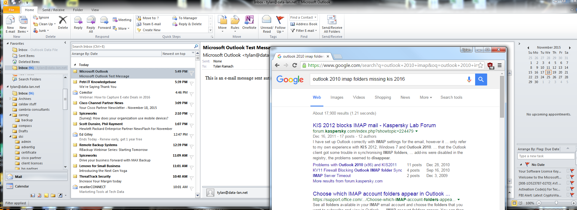 The user had constant hanging when opening Outlook. I went with standard troubleshooting, Outlook in safe mode and also a run of SCANPST. Outlook seemed better, then I rebooted and it seemed the mess started all over again. The customer noted that only about half of the IMAP folders were showing on the folder view on the left. Through troubleshooting I was able to determine that the issue was related to Kaspersky.