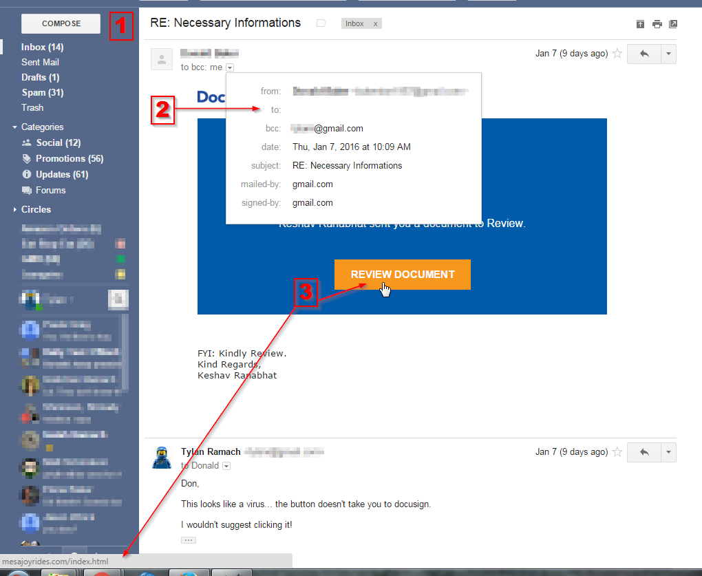 - View the details of the From, To, CC, BCC. In Gmail I clicked the show details drop down. I saw that my name was not in the to box. This tells me this is is probably SPAM or in this case something worse. Red Flag!